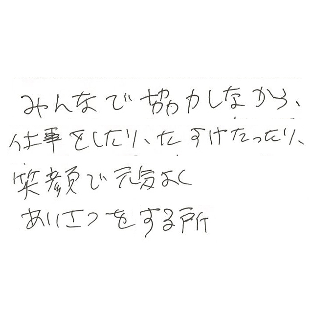 みんなで協力しながら仕事をしたり、たすけあったり、笑顔で元気よくあいさつをする所