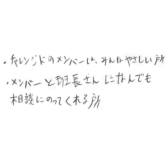 チャレンジドのメンバーは、みんなやさしい所、メンバーと班長さんになんでも相談にのってくれる所