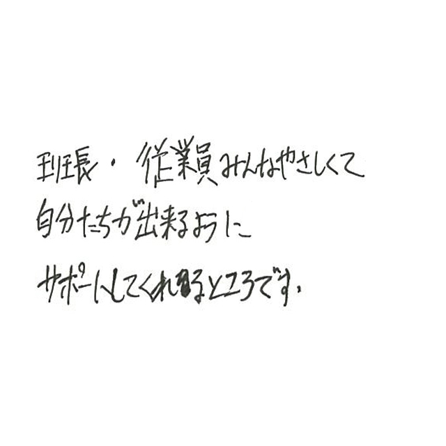 班長・従業員みんなやさしくて自分たちが出来るようにサポートしてくれるところ