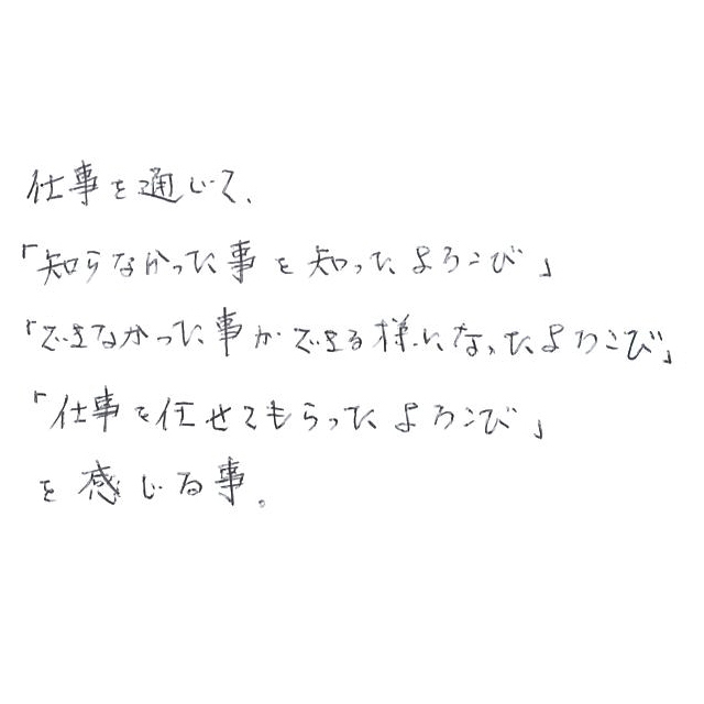 仕事を通じて「知らなかった事を知るよろこび」「できなかった事ができるようになったよろこび」「仕事を任せてもらえたよろこび」を感じる事