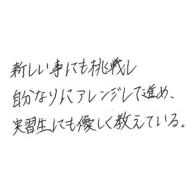 新しい事にも挑戦し自分なりにアレンジして進め、実習生にも優しく教えている